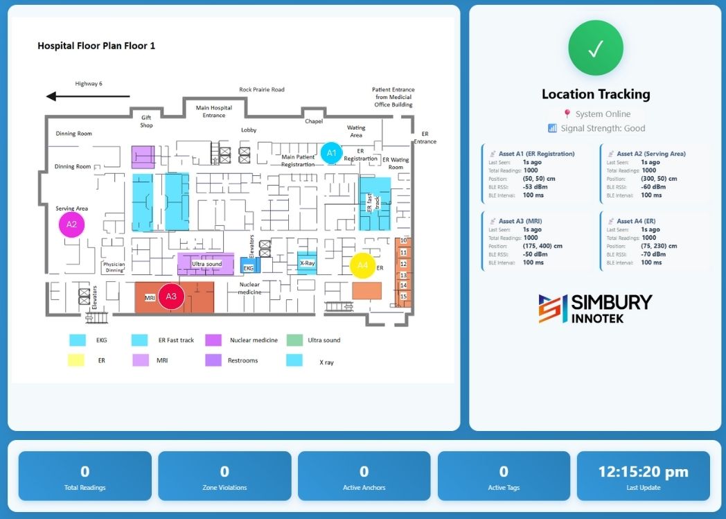 Simbury InnoTek’s Indoor Asset Tracking System uses an easy-to-install solution that combines Ultra-Wideband (UWB), Bluetooth Beacon, LTE 4G, and other technologies to deliver precise asset tracking and monitoring accuracy.
