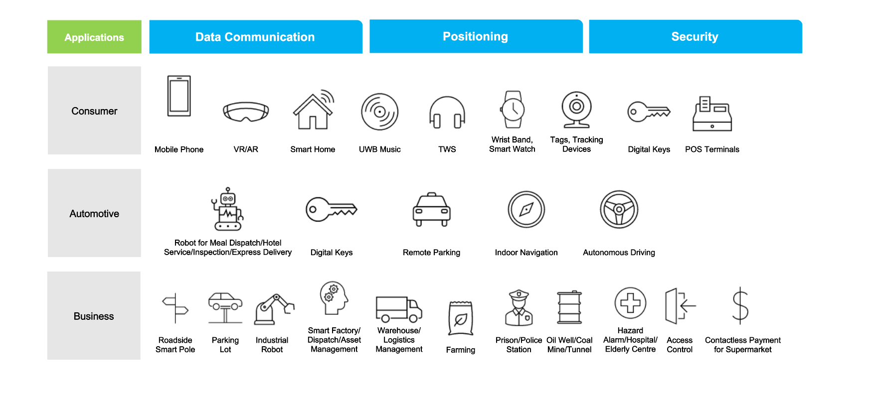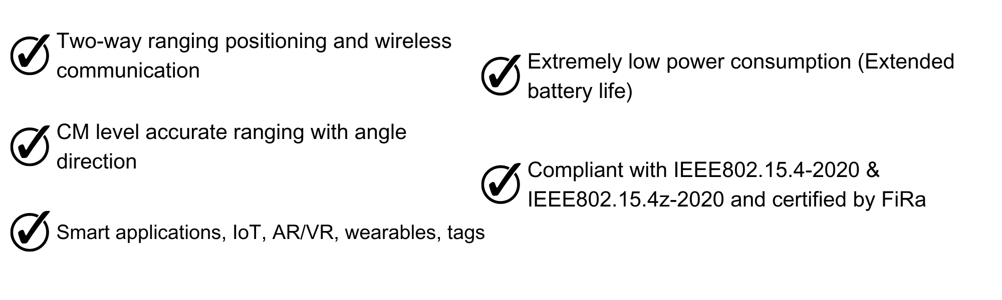 A fully integrated single chip Ultra Wideband (UWB) low-power low-cost system including RF transceiver, baseband, protocol, software, MCU, SRAM, Flash and generic interfaces, compliant with IEEE802.15.4-2020 & IEEE802.15.4z-2020 and certified by FiRa high rate pulse repetition frequency (HRP) UWB standards. Support various ranging and positioning methods: two-way ranging (TWR) based on time of flight (ToF), time difference of arrival (TDoA), 3D angle of arrival (3D AoA).